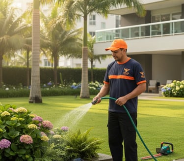Manutenção regular que garante a estética e o crescimento saudável do gramado, arbustos e cerca vivas.